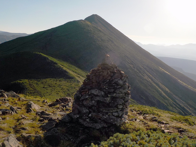 22日朝4時、冷え込んだ小屋の寝床の中で、一瞬ためらいが生じた。ああ、一瞬でも仮眠が取れないものか。ほとんど不眠状態で山に挑んだ経験は思い浮かばない。 だが、行くしかない。僕はそろそろと寝具を片付け、簡単な行動食を口にすると、サブ行動の荷物の再チェックにかかった。 服装はどうしよう?この寒さではフリースもジャージも着たままでいいのでは?だが、これまでの経験がそれを打ち消した。動けば暑くなるに決まっている。時間とともに気温も上がるだろう。結局、上は半袖Tシャツの上にカッパ、下はタイツの上にカッパで行くことに決めた。 ヤンキー氏はシュラフにもぐったまま朝メシの準備をしている。 「What time will you depart?」 「Ah, one or two hours later,maybe」 呑気なもんだ。でもそれが長期間山をさすらうコツかも知れない。僕には無理だ。 ドアを開けて外に出た。お天気は回復傾向にある。間もなく晴れるだろう。 一瞬、吹き付けた風が生暖かく感じられた。 (寒くない、これならいけそう) 不思議に眠気もなかった。 小屋から上は森林限界。エゾマツの中を緩やかに上る。昨日の苦しい登りが嘘のように感じられる。 すぐ南東側には美瑛富士が優美な山体を見せている。だが、今回の登山対象ではない。私の目的はあくまで北に聳えるオプタシテケ山だ。 小屋からの標高差は400mほどしかないが、途中で2つのピークを越えないといけない。まあ、焦らずに行くとしよう。 ガレ場を登ると一つ目のピーク。これはどうやら右側を巻くようだ。登り切ったところで早くもオプタシテケが姿を現した。もうすっかり晴れ渡って、トムラウシ、大雪方面も視界に入っている。 上写真のようなケルンが現れた。登山者が気まぐれで積んだようなものではなく、明らかにセメントで固めた構造物だ。おそらく霧のときなどに目印になるのだろう。 その向こうにあるピークには直登だった。 ほぼ水平な尾根歩きを続けていると、向こうから学生らしき一団がやって来た。女子も混じっており、何やらユルそうな雰囲気。 「ワンゲルですか?」 「はい、そうです。」 「頑張ってください。」 「ありがとうございます。」 すれ違うとき、後でヒソヒソ声が聴こえる。 「ネイチャーハイクだってさ。」 「ピッケル持ってるよ。」 ネイチャーハイクとは、神威岳のときから使用している「完全防水」のサブザックである。封筒のような構造で、上で巻いてロックするようになっている。今回、次のカムイエクウチカウシ山の沢登りがあるので、ここでも使用している。 ピッケルが熊対策の最終兵器であることを彼らは理解できただろうか? 二つ目のピークは直登だった。そしてそれが実質最後の登りだった。 午前7時25分、山頂に到達した。コースタイム3時間20分を1時間近く下回っている。昨日の登りにほぼコースタイムくらいかかったことを考えれば雲泥の差だ。 サブ行動にはまだ自信があるが、荷物を背負ったときのパフォーマンス低下は年々ひどくなっている。長年、山麓連泊・サブ行動を基本としてやってきたので、体がもうそれに慣れきっているのか。 何はともあれマジック3のピークだ。やや雲が多いとは言え、360度の見晴らし。何か、北海道全体が見えているような感覚だ。 いつものことで、写真だけ撮るとすぐに引き返した。登山口までなるべく早く下りたい。昨日のようなにわか雨は真っ平だ。 帰りも楽ちんだった。あまりに楽すぎて眠気が・・・こんなときのために用意してきたのが・・・「食べる珈琲」。珈琲をフリーズドライして固めたキャンディーで、カフェイン効果が確かにある。小粒なので一度に4粒くらい食べないといけないが・・・ 小屋が見えてくると、さっきのワンゲルグループが空身で美瑛富士を登っていくのが見えた。元気なもんだ。僕も若い頃はピークと見れば登っていた気がする。彼らはテント泊で、小屋には泊まらないようだ。 小屋に帰り着くと、さすがにヤンキー氏はいず、他の登山者の荷物が見えた。僕の荷物のすぐ横に汗をかいたTシャツが干してあり、いかにも「早くどけ。」と言わんばかり。さっきすれ違った登山者だろう。 行動食を摂ると、さっさと荷物をまとめてここを後にした。 昨日ほどではないにせよ、下りもひたすら「我慢大会」だった。この下りで脚に負担をかけてしまうと、筋肉痛が残るので、和泉音弥風にソロリソロリと・・・ 汗をふきふき、水平道に出ると、登山口は近い。ここでタクシー会社に電話してお迎えを早めてもらった。 あ、それと皆様にはどうでもいいことだが、最近ケータイのキャリアーを変えた。これまでは「ソフトバンクの電波」だったのが「auの電波」に変わった。すると、これまでだったら圏外だったような山の中でもピコピコ着信音が鳴り、遙かに山での利便性が向上した。金銭的には安上がりかどうかはビミョーだが、山の安全性には明らかにプラスとなった。 タクシーで美瑛に着くと、予約した高速バスにはまだ1時